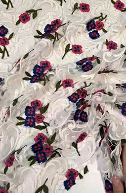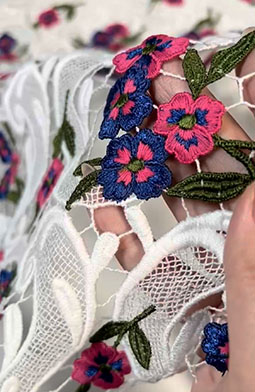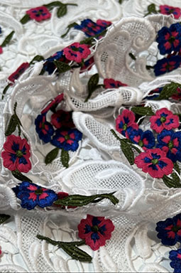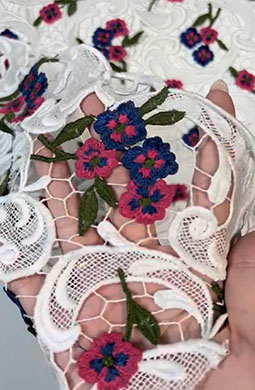 - Цвет — белое кружево с розовыми и синими цветами, зелеными листиками