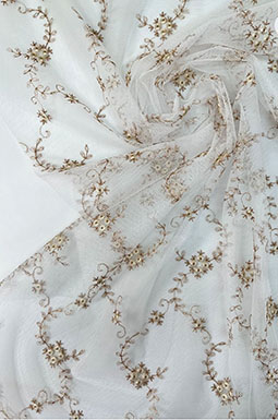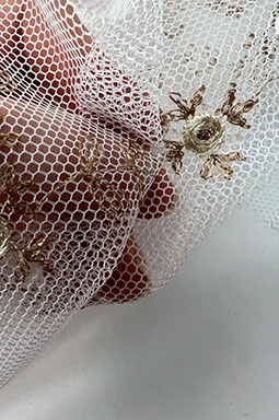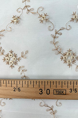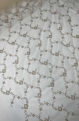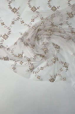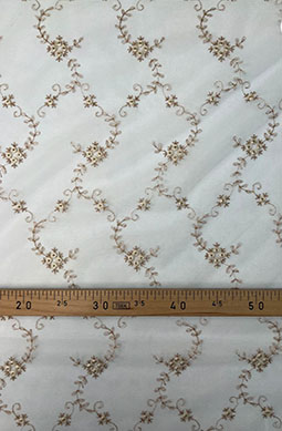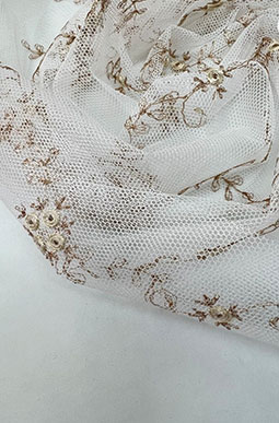 Восхитительная ткань сетка с вышивкой Albert Guegain — Франция , цвет шампань. Ткань сетку с вышивкой можно использовать при пошиве восхитительного, свадебного или вечернего платья, а также для украшения одежды отдельными элементами рисунка, которые можно вырезать из основной ткани и разделить на красивые фрагменты, украсив любую часть платья, блузки, костюма, халата, ночной сорочки или юбки необыкновенно роскошным узором цветов на сетке. Ткань сетку с вышивкой купить — цена 9,800 рублей, производство Франция высшего качества с роскошной вышивкой мелкими цвеами.